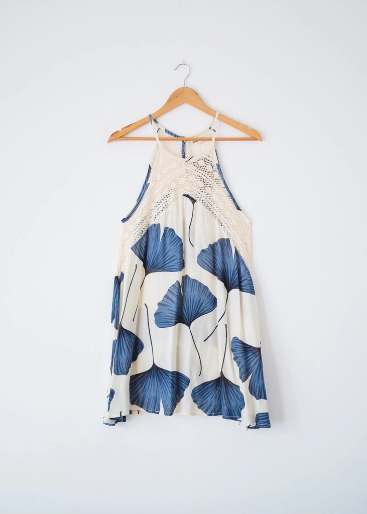 Vestido corte A con escote halter. Se abrocha por la espalda con botones al tono. Este modelo esta confeccionado en una fibrana de algodón estampada combinado con recorte en guipiure de algodón en el escote delantero y trasero.