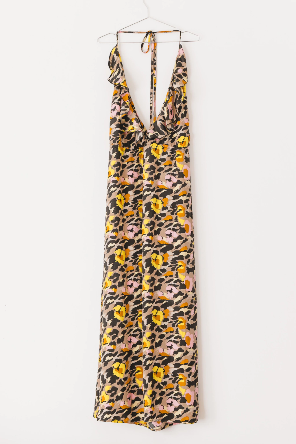 Vestido largo, escote cruzado profundo con detalle de volado.