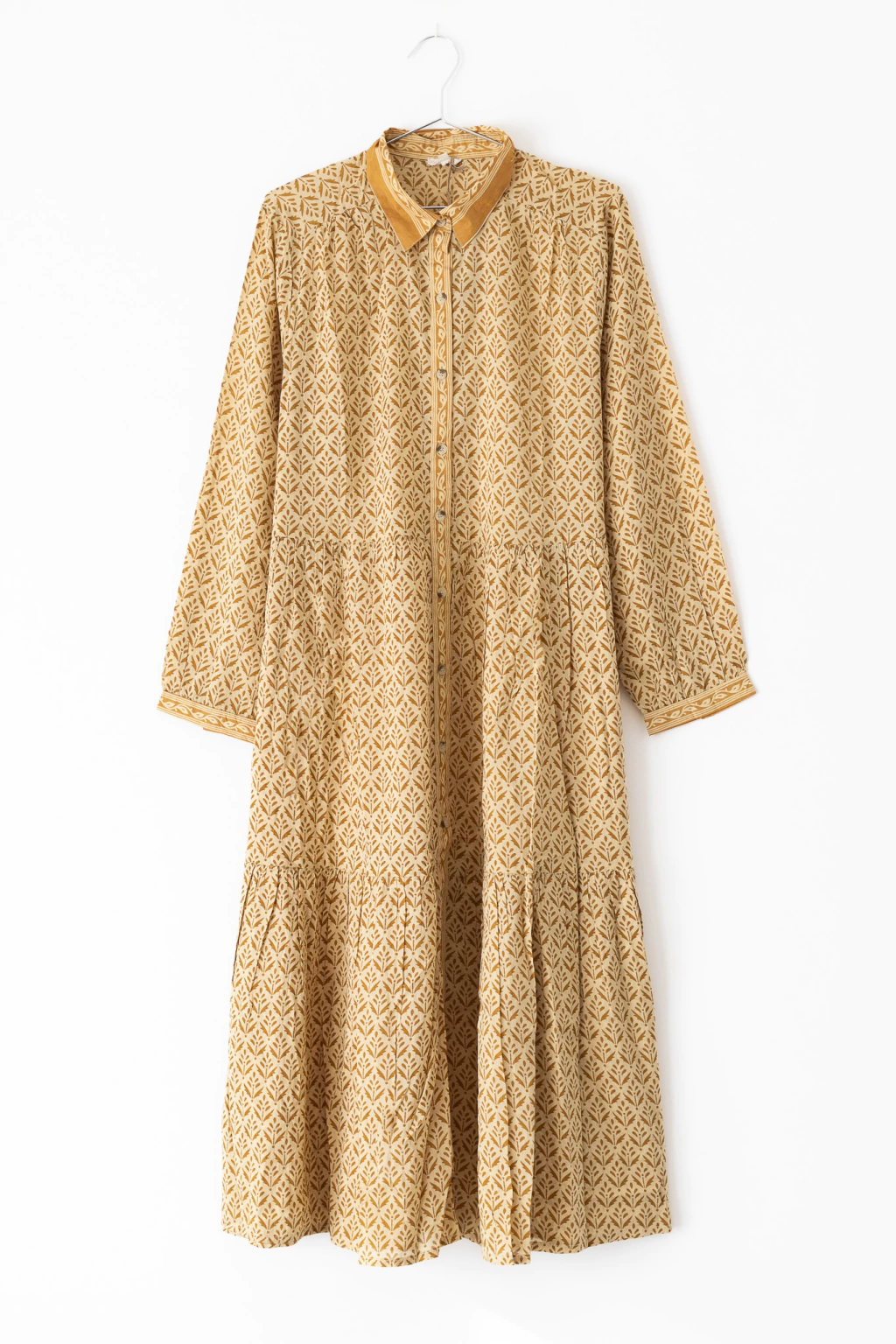 Vestido camisero largo escote V & cuello camisero confeccionado en algodón printed. Posee cartera delantera con botones que nos permiten usar la prenda tanto abierta como cerrada. Manga larga con loops para regular el largo y terminación de puño con botón. La falda esta compuesta por recortes, los cuales le otorgan un fascinante vuelo a la prenda.
